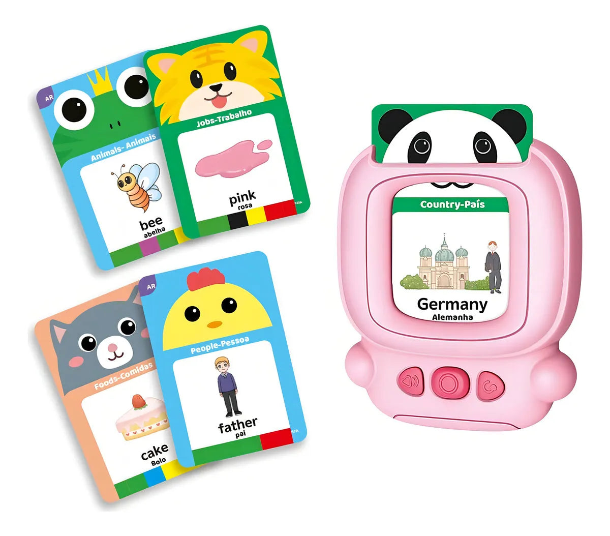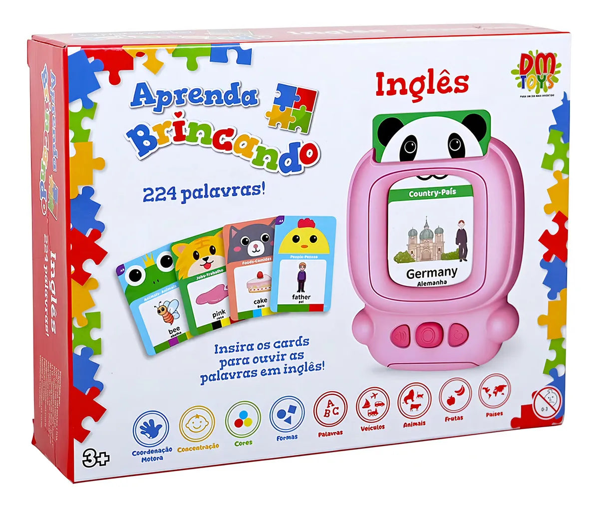 Torne o aprendizado de inglês mais divertido com este brinquedo interativo! Ele ensina 224 palavras em inglês para aprender cores, países, formas, animais, entre outras, por meio de cartões ilustrados que, ao serem inseridos no dispositivo, falam a palavra em voz alta.