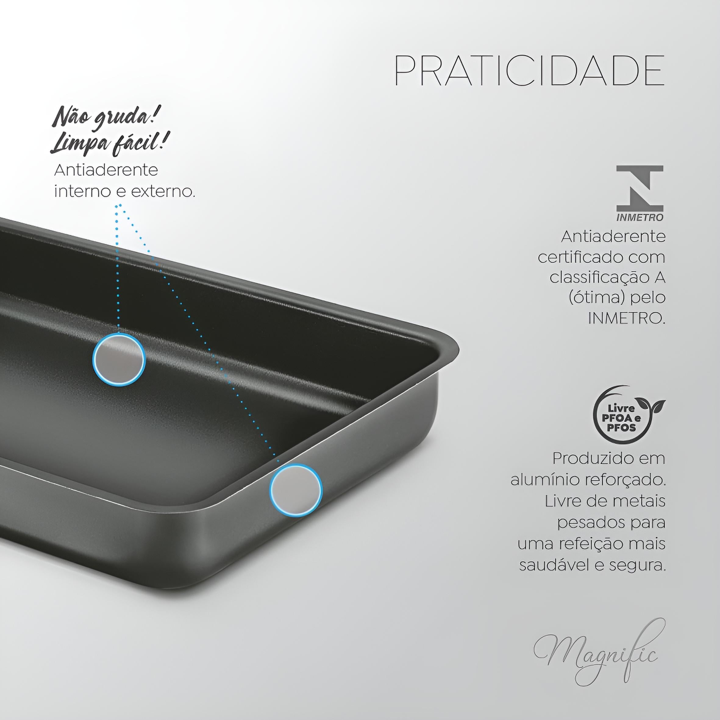 Prepare suas receitas favoritas com praticidade e eficiência com a nossa assadeira retangular antiaderente. Ideal para assar carnes, legumes, pães e bolos, essa assadeira é feita com material de alta qualidade, garantindo durabilidade e resistência. Seu revestimento antiaderente facilita a limpeza, evitando que os alimentos grudem e permitindo um uso mais eficiente de óleo ou manteiga.