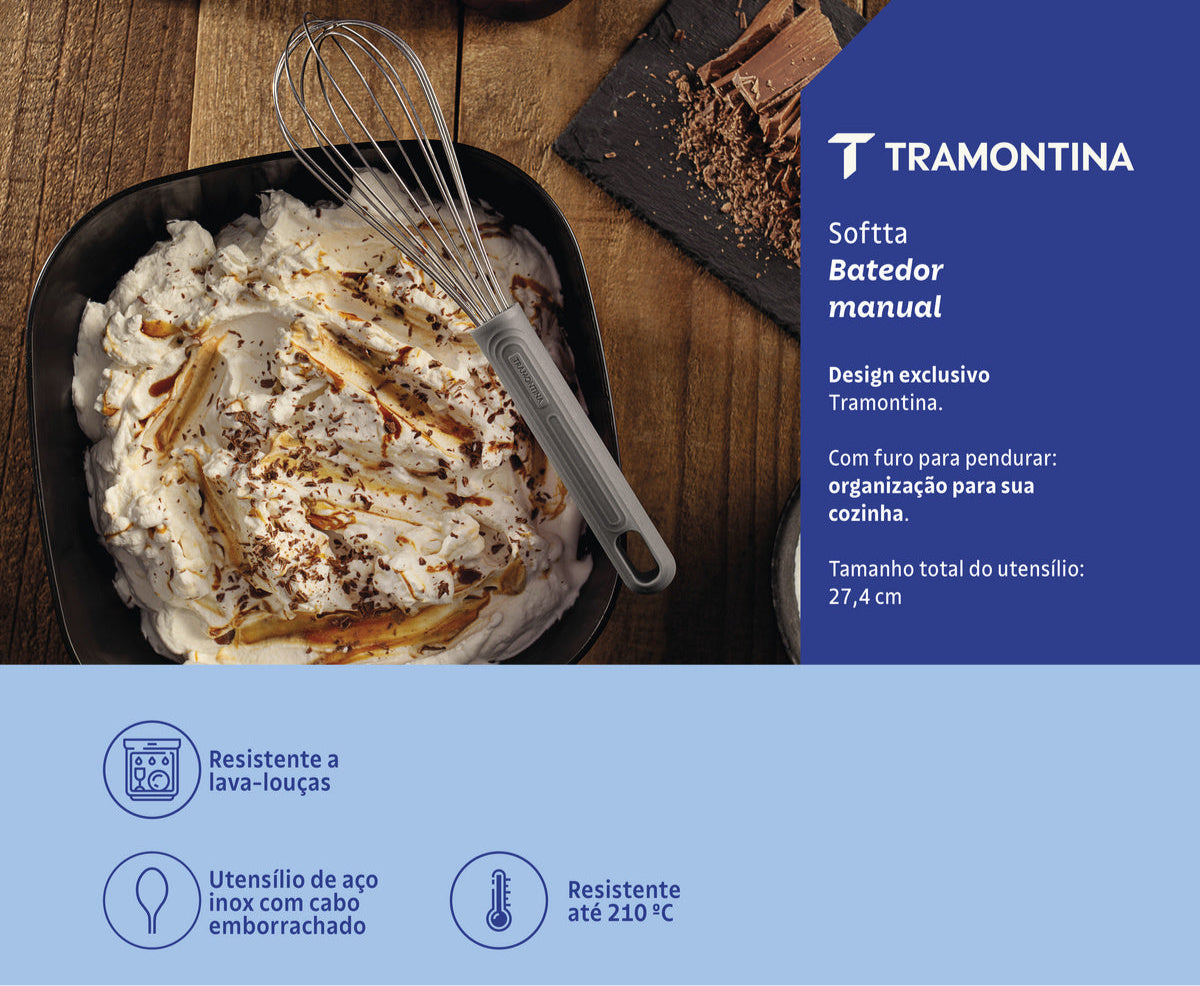Projetado com silicone resistente a temperaturas de até 210ºC, ele é ideal para misturar e bater ingredientes de forma rápida e eficiente. Ssua compatibilidade com superfícies antiaderentes facilita o uso e a limpeza. Oferecendo a qualidade e durabilidade, o batedor manual da linha Softta é a escolha perfeita para suas receitas.