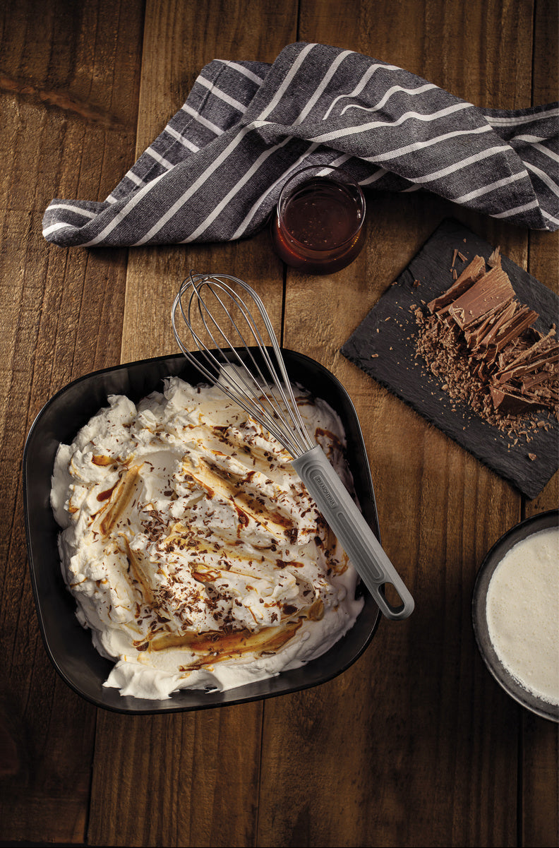 Batedor de aço inox e cabo emborrachado, que resiste até uma temperatura de 210 °C.