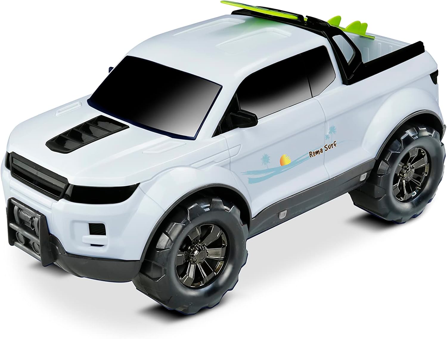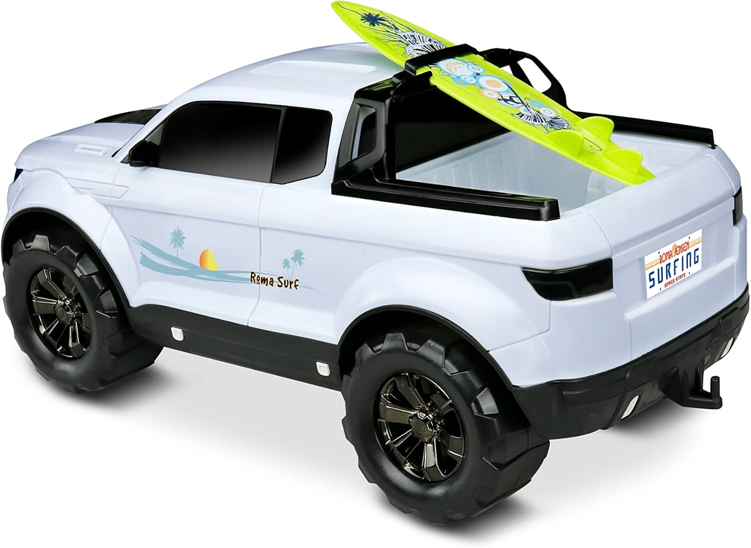 A Picape Force Surfing da Roma chega triunfante para incendiar as aventuras de quem ama sentir o espírito da estrada e do surfe num só brinquedo. Imagine a liberdade de explorar, deslizar e desafiar terrenos imaginários com estilo: esta caminhonete grande imita o visual de um veículo robusto e poderoso, com rodas proeminentes que dão o tom de aventura e uma prancha de surfe presa à carroceria que convoca para desafios na areia ou em mares fictícios. Ela não exige combustível — basta empurrar ou deixá-la rolar livremente para que a imaginação pule no volante.