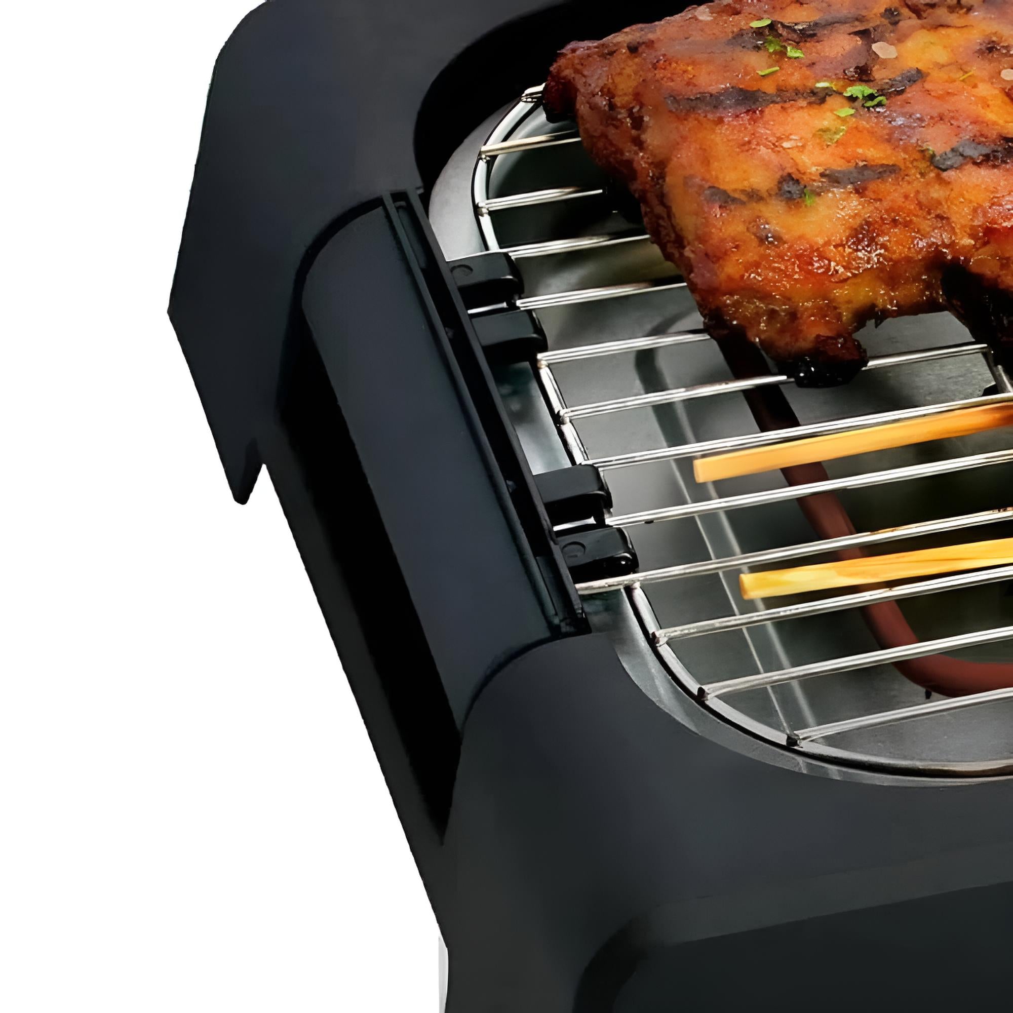 Compacto, ideal para grelhar carnes, hambúrgueres, frangos, linguiças e muito mais de maneira simples, rápida e saudável. Grande superfície com grelha em aço com duas posições de altura e alças laterais com toque frio. Possui bandeja coletora de gordura. É totalmente desmontável para facilitar a limpeza e tem sistema de segurança com desligamento automático ao remover a resistência.
