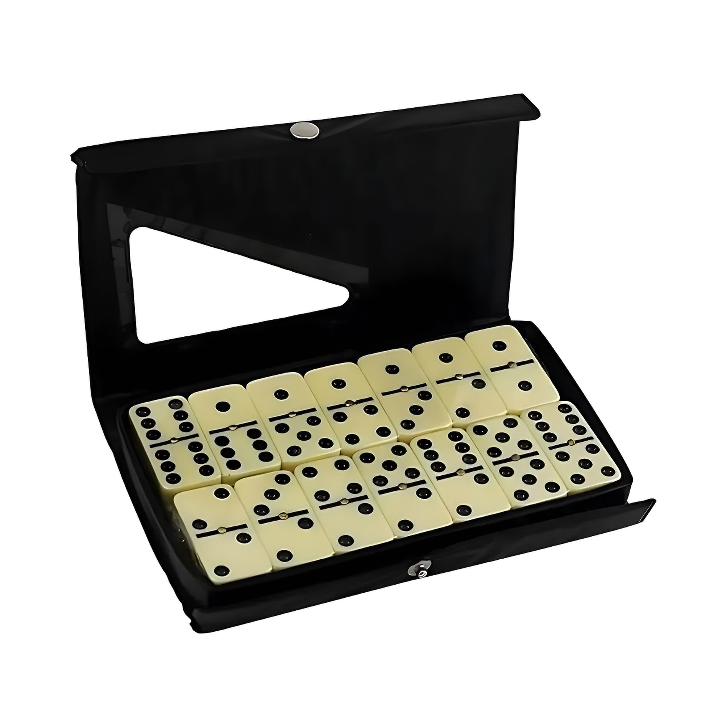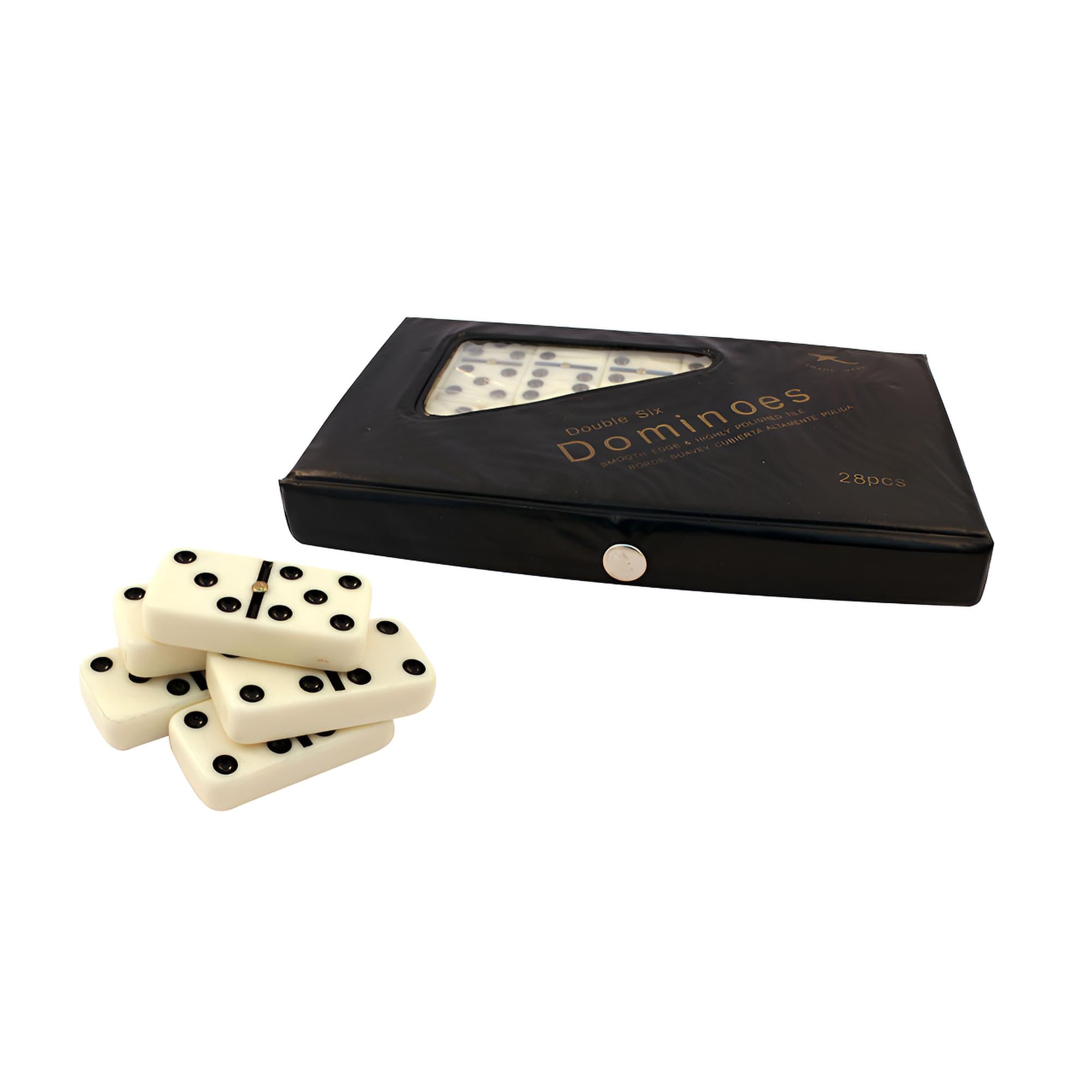 Leve a diversão para qualquer lugar com este jogo de dominó! O conjunto inclui 28 peças tradicionais com acabamento liso e marcadores em relevo de fácil visualização. Acompanha um estojo resistente em couro sintético preto com fecho de botão de pressão e visor triangular transparente, ideal para armazenamento e transporte com segurança. Este dominó é ideal para reunir amigos e família em momentos de lazer e estratégia.