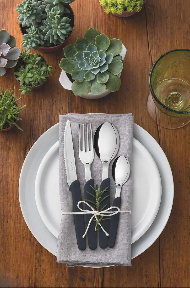 Traz para o dia a dia mais leveza, além de modernidade para a sua mesa. O faqueiro conta com garfos, facas para churrasco, colheres e colheres de chá produzidas com lâminas em aço inox e espessura que mantém formas inalteradas mesmo com uso intenso. Os cabos são produzidos em polipropileno, que oferecem um manuseio confortável e seguro.
