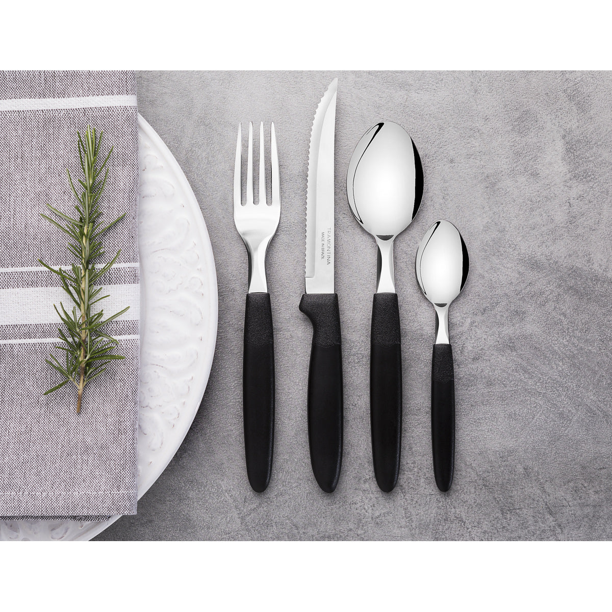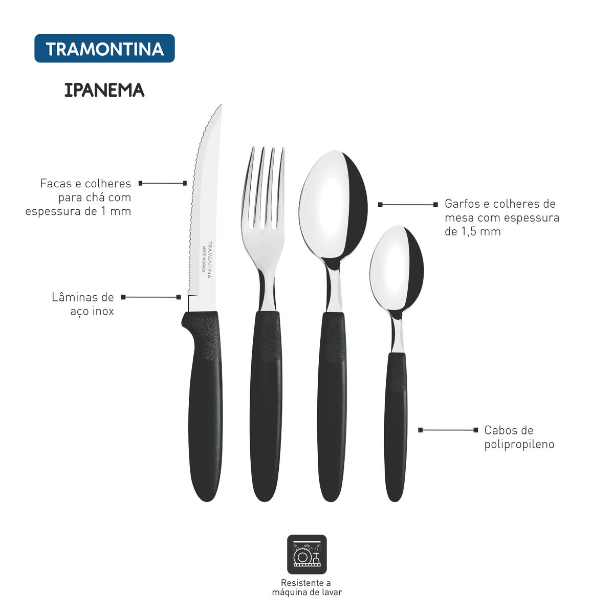Os cabos são produzidos em polipropileno e garantem maior conforto no manuseio, além de deixar sua mesa muito mais moderna, devido a cor preta. Ele ainda acompanha um pote plástico, perfeito para armazenar suas peças ou alimentos como macarrão ou outros grãos. Com certeza, a escolha ideal para sua cozinha!