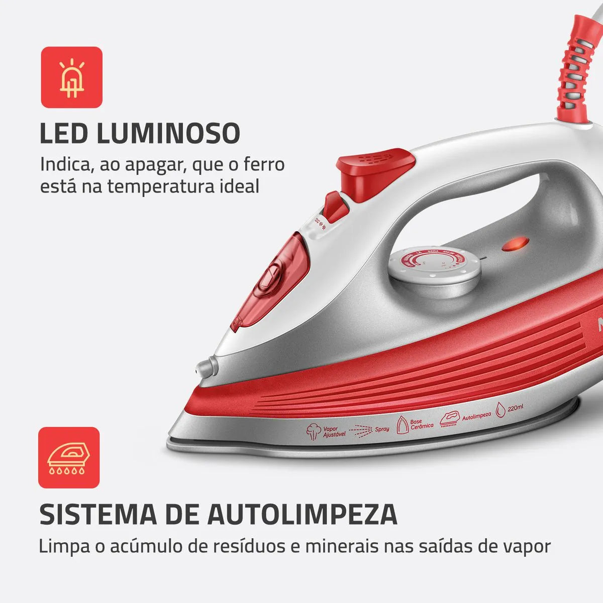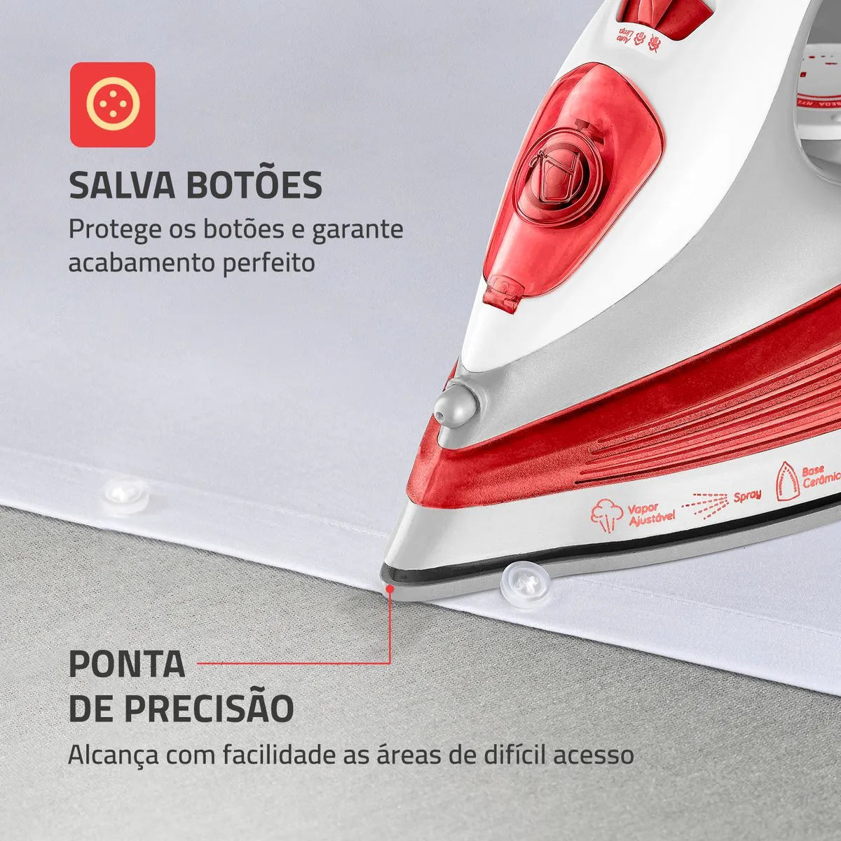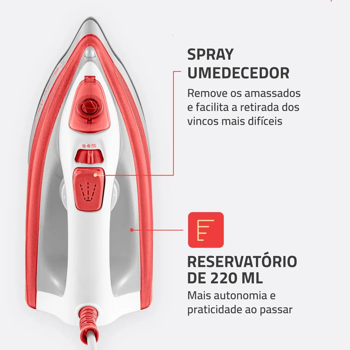 Recursos: Com sistema de autolimpeza, vapor continuo, salva botões e spray umedecedor.