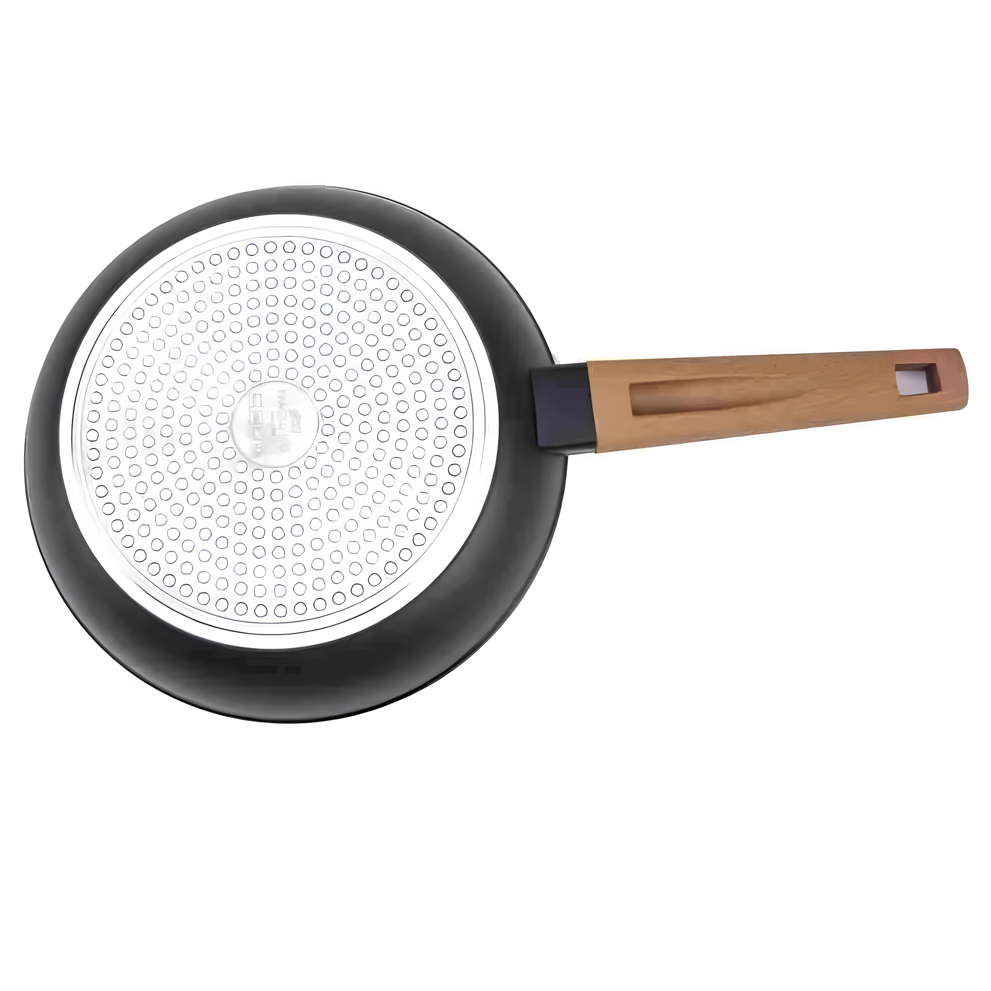 Seu interior conta com revestimento cerâmico, que proporciona cozimento uniforme e evita que os alimentos grudem, facilitando tanto o preparo quanto a limpeza. O corpo em alumínio garante leveza e excelente condução de calor, enquanto o cabo de madeira traz um toque rústico e seguro, com pegada confortável.