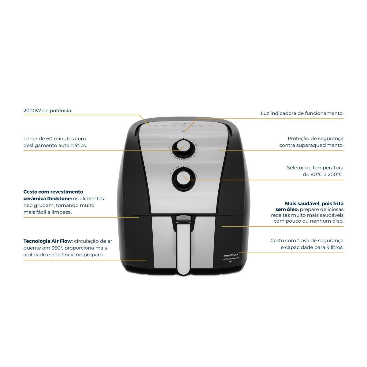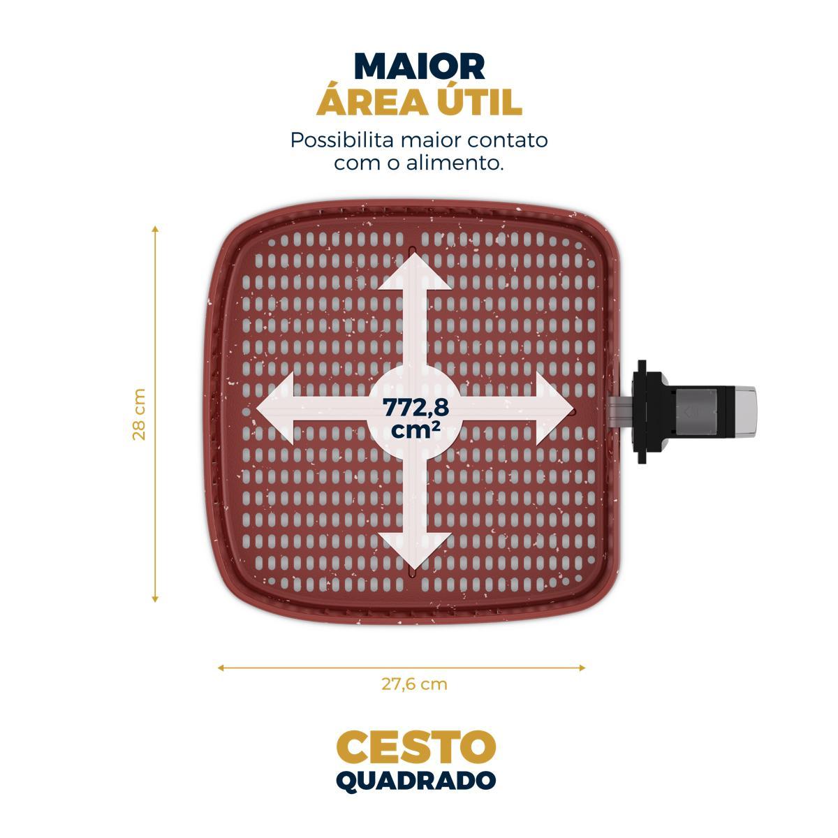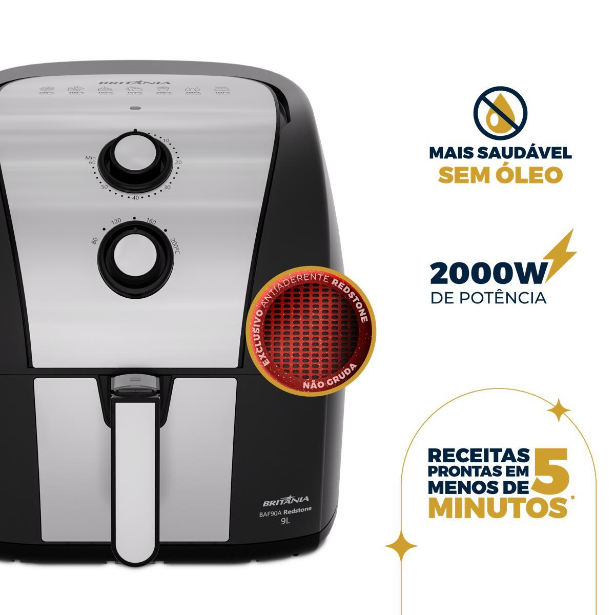 Descubra o prazer de cozinhar com a Air Fryer Britânia 9L 2000W Antiaderente Redstone BAF90A, onde cada refeição se transforma em uma experiência deliciosa e saudável. Com uma super capacidade de 9 litros, ela é perfeita para preparar pratos para toda a família, garantindo que ninguém fique de fora. Imagine o aroma irresistível de suas receitas favoritas sendo preparadas com rapidez e eficiência, graças aos 2000W de potência. O cesto quadrado e antiaderente Redstone não só otimiza o espaço, mas também facilita a limpeza e garante que seus alimentos não grudem, mesmo nas receitas mais ousadas. A tecnologia Air Flow, com circulação de ar quente em 360 graus, assegura que cada ingrediente seja cozido de maneira uniforme, crocante por fora e suculento por dentro. Equipado com o seletor de temperatura ajustável de 80 a 200 graus, você tem o controle total sobre o ponto perfeito de cada refeição, o que torna o preparo mais intuitivo e agradável. A Air Fryer Britânia BAF90A é mais do que um eletrodoméstico, é a chave para uma cozinha mais prática e saborosa!