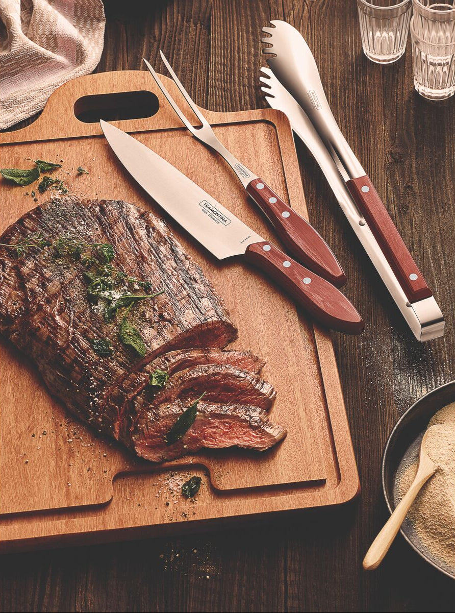 O jogo é produzido com lâminas em aço inox, a faca oferece um excelente corte, o material é altamente durável. Possui um belíssimo cabo de madeira tratada Polywood que resiste à impactos e altas temperaturas, e traz a beleza da linha Churrasco para conquistar a admiração de todos. O jogo conta com 03 peças; Faca, garfo e pegador, os utensílios que todo bom churrasqueiro precisa ter.