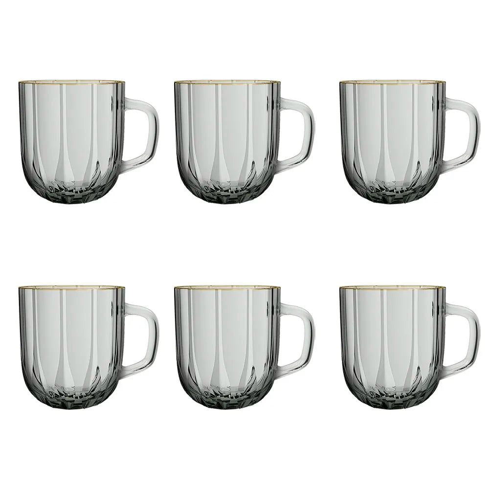Este conjunto combina a sofisticação do cristal fumê com o toque refinado da borda dourada, proporcionando elegância e glamour a cada gole. Perfeito para quem busca um toque de requinte em sua mesa, este conjunto é ideal para desfrutar do seu café favorito ou qualquer outra bebida quente com muito estilo. Transforme suas pausas para o café em momentos de luxo.
