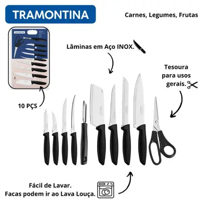 O jogo de facas Tramontina Plenus com lâminas em aço inox e cabos de polipropileno preto 10 peças possui as lâminas das peças produzidas em aço inox com tratamento térmico e cabos de polipropileno, garantem alto poder de corte, resistência e maior durabilidade. Um jogo que ainda pode ser levado à máquina de lavar louças.