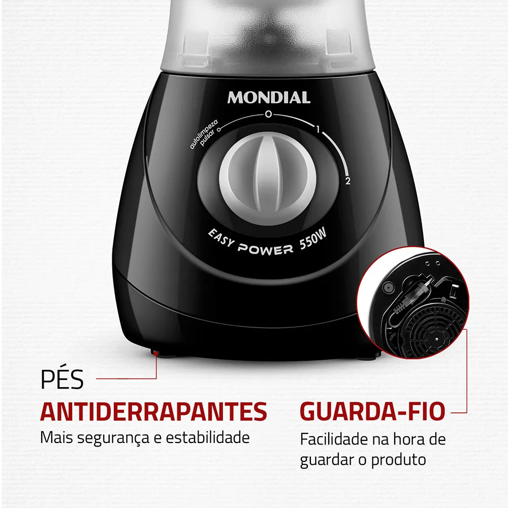 Para quem busca agilidade e eficiência na cozinha. Com 550W de potência e capacidade total de 1,9 litros, ele permite preparar uma grande variedade de receitas com facilidade, como sucos, vitaminas, molhos e muito mais. Seu copo resistente a quebras e riscos garante maior durabilidade e segurança durante o uso. As lâminas em aço inox trituram os ingredientes com precisão e rapidez, e, além disso, não enferrujam, tornando-se mais duráveis.