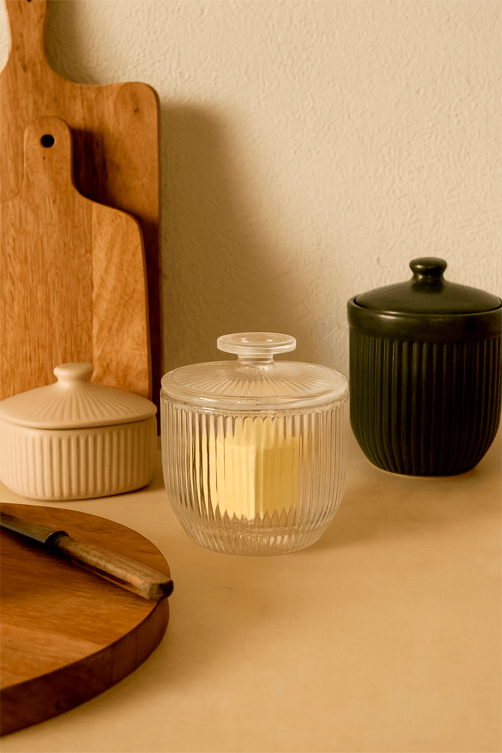 É um utensílio elegante e funcional projetado para armazenar a manteiga de forma prática e sofisticada. Inspirada em métodos tradicionais de conservação, esta manteigueira permite manter a manteiga em temperatura ambiente sem comprometer sua frescura, criando um espaço de vácuo que evita o contato com o ar.
