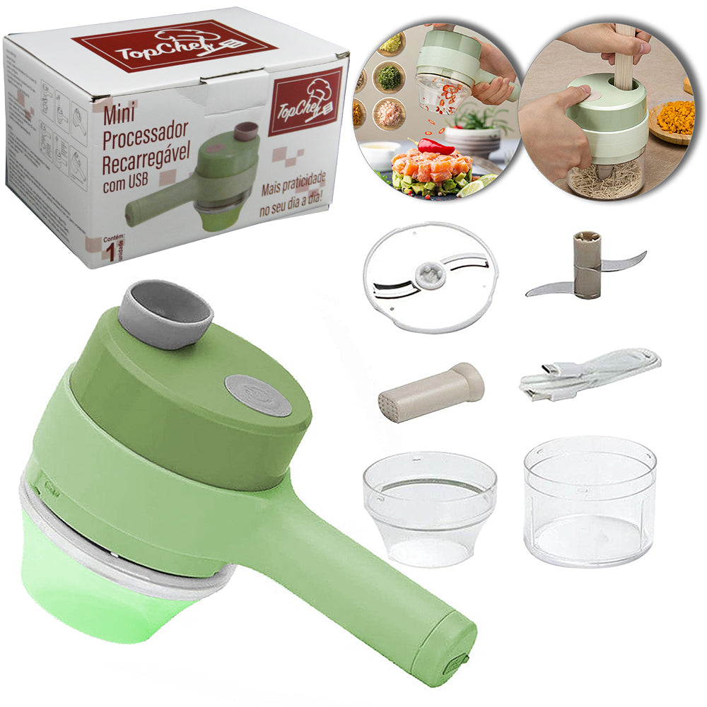 Compacto, eficiente e recarregável via USB, ele oferece praticidade no corte e na preparação de alimentos. Perfeito para quem tem pouco espaço ou tempo na cozinha.