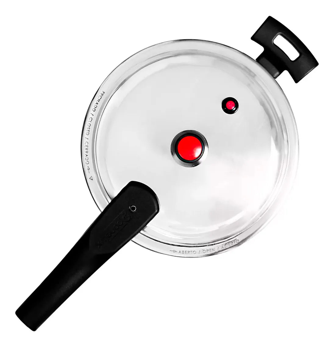 Seu corpo resistente em alumínio proporciona aquecimento uniforme, enquanto o acabamento interno e externo é antiaderente. A tampa com sistema de fechamento interno seguro conta com válvula controladora de pressão e trava de segurança, garantindo total proteção durante o uso.