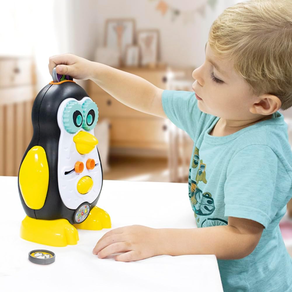 O Pinguino Educativo da Maral é um convite irresistível para o aprendizado que encanta desde os primeiros meses. Com aquela carinha fofa de pinguim, ele inspira curiosidade a cada interação: insira moedas na barriguinha para vê‑lo bater as asas e liberar a surpresa; gire os olhos; pressione o bico e ouça o som “week week”; deslize os botões frontais para que as asas se movam — tudo isso desperta sorrisos, atenção e vontade de descobrir. Ele é companheiro de descobertas sensoriais, estimula coordenação entre olhos e mãos, fortalece os dedinhos e ensina a compreender causa e efeito de forma natural. Um brinquedo que diverte, desafia e constrói confiança, ideal para momentos de alegria, aprendizado e encanto em família.