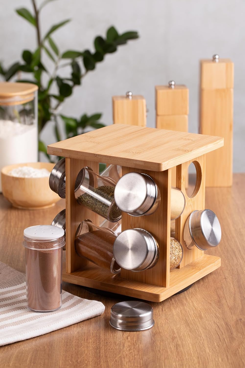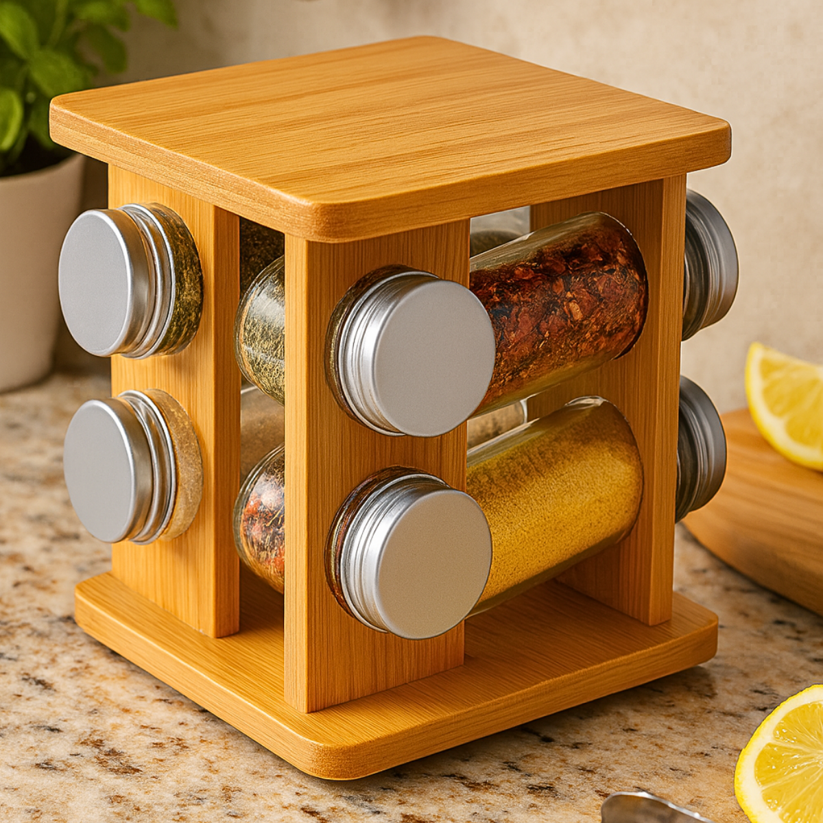 Perfeito para manter seus temperos organizados e sempre à mão. Os potes de vidro permitem visualizar o conteúdo facilmente, e as tampas de Aço Inox ajudam a preservar o frescor e o aroma dos condimentos. Compacto e prático, este organizador otimiza o espaço e traz sofisticação ao ambiente, ideal para quem busca praticidade sem abrir mão do estilo.
