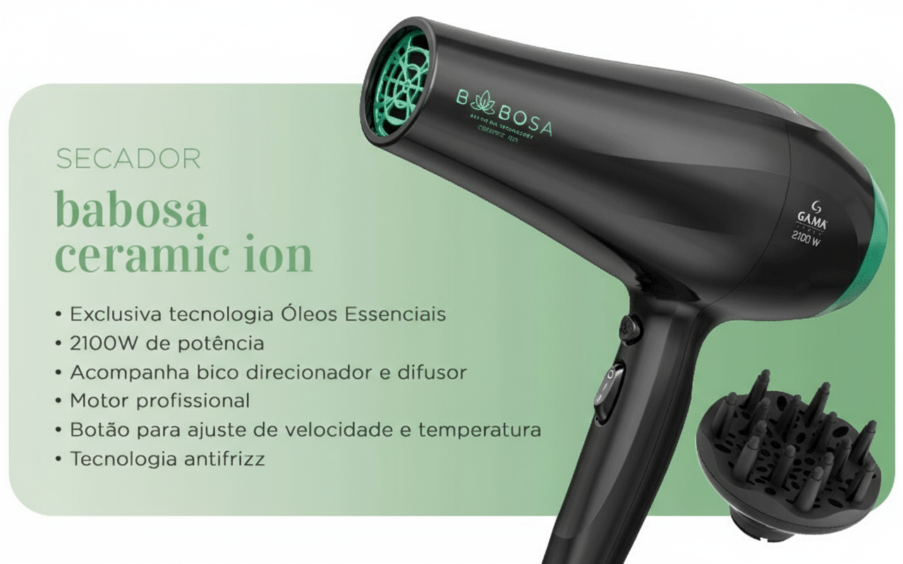 Com o Secador Babosa Ceramic Ion, você consegue o melhor dos cuidados profissionais com a praticidade de uso diário. Garanta fios sedosos, fortes e cheios de brilho, com um toque de cuidado natural!