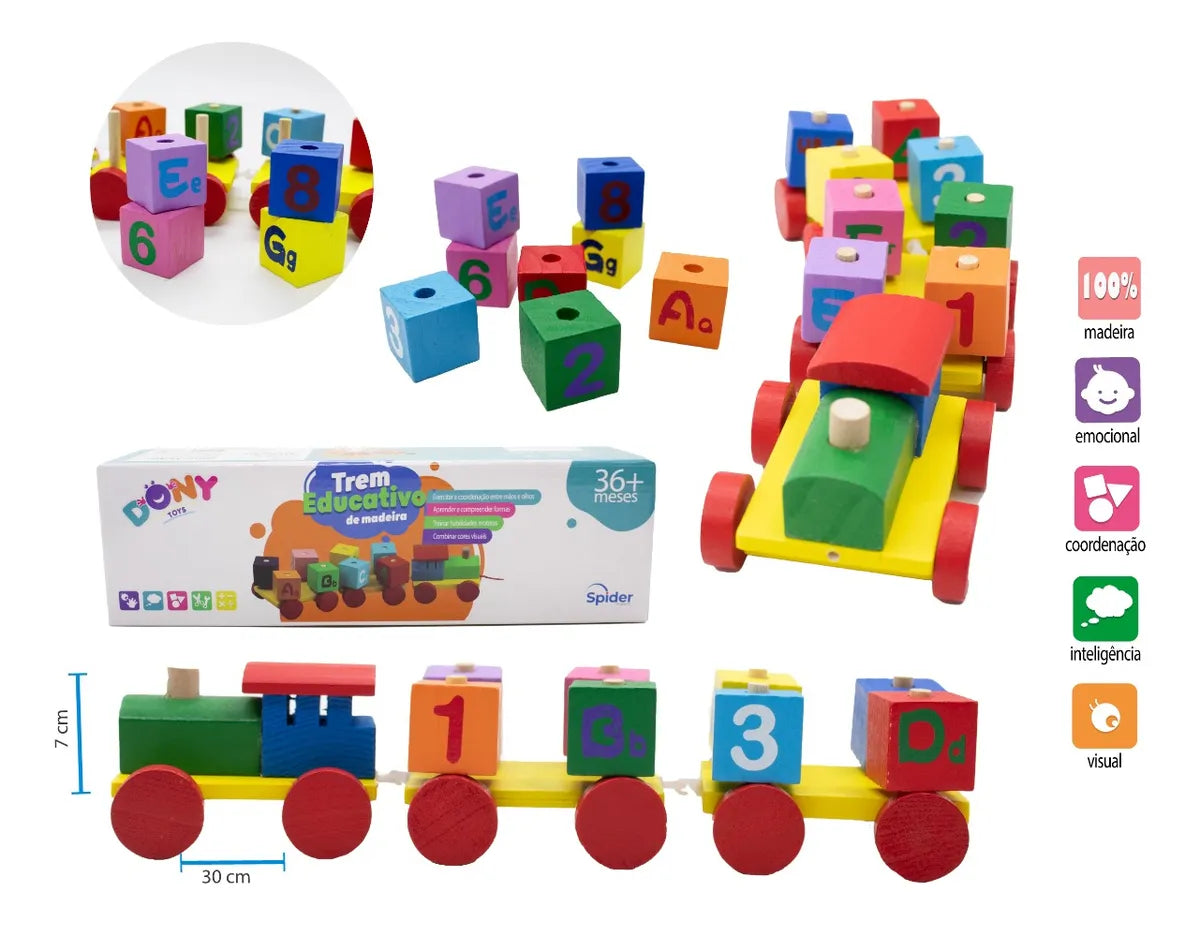 O Trem Educativo de Madeira é um brinquedo clássico que une diversão e aprendizado em uma só brincadeira! Produzido com material resistente e acabamento seguro, ele estimula a coordenação motora, o raciocínio lógico e o reconhecimento de formas e cores enquanto a criança monta, desmonta e puxa seu trenzinho.
