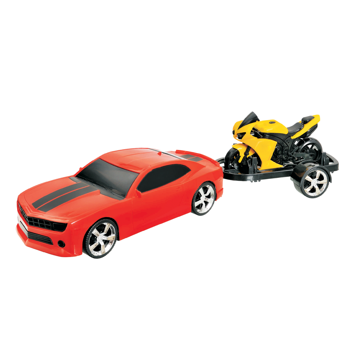 Carro de brinquedo robusto equipado com reboque acoplado, transportando uma super bike em miniatura. Ideal para crianças que apreciam veículos de carga e motocicletas de alta performance. O conjunto oferece múltiplas possibilidades de brincadeira, estimulando a criatividade e o interesse por máquinas. Construído com atenção aos detalhes, proporciona horas de diversão imaginativa e educativa.